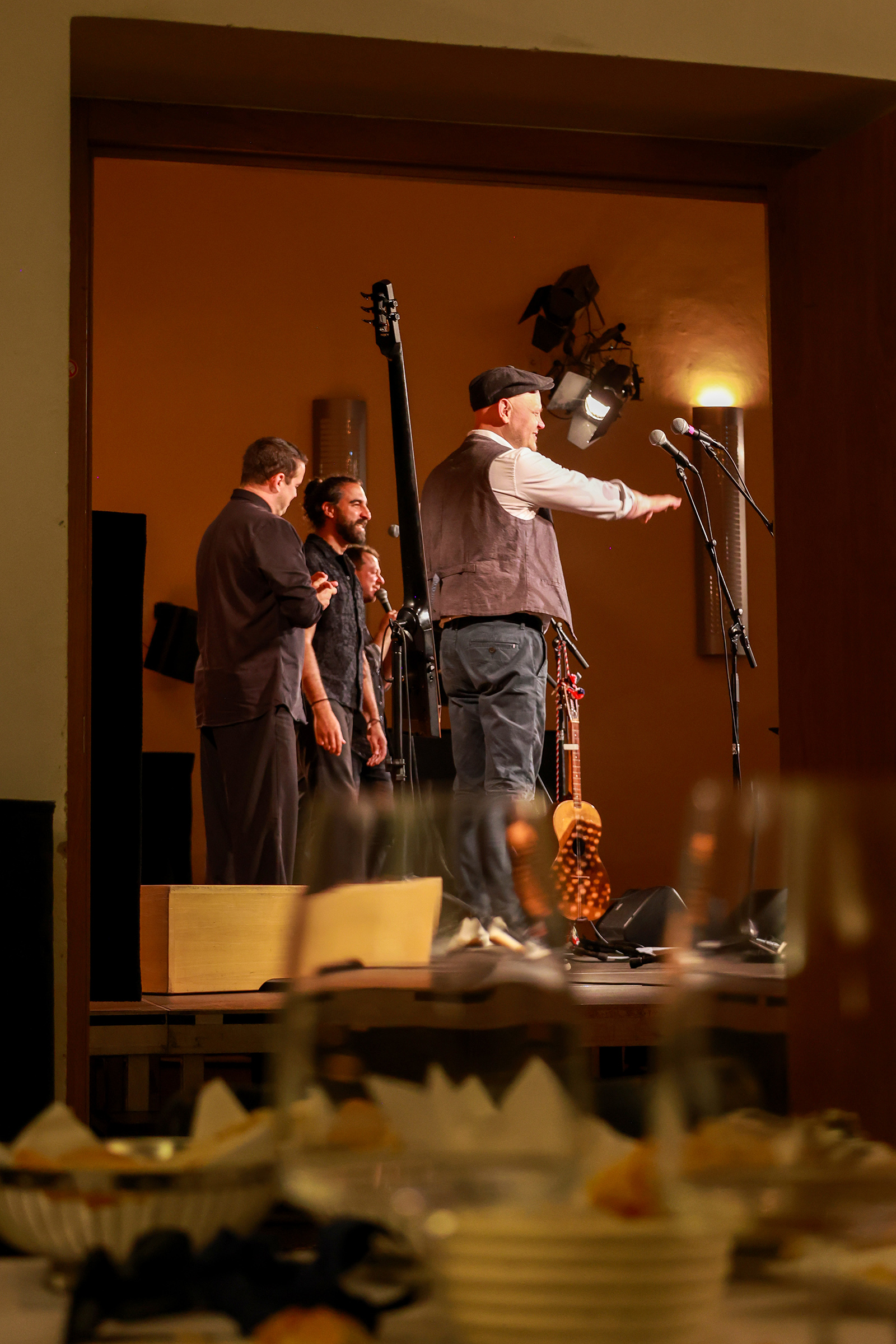 Zwei Absolventinnen und ein Absolvent von chor.leiten bravura dirigierten im Haus der Regionen nicht nur bei ihren Lehrproben, sondern auch im Rahmen des Abschlusskonzerts. Ihnen zur Seite stand ein Ensemble des Arnold Schoenberg Chores. Den künstlerischen Rahmen und gleichsam einen musikalischen Kontrapunkt stellte das Gastensemble Basbaritenori.