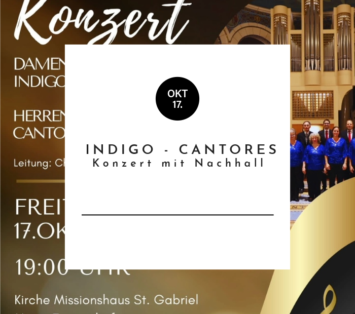 Am 17. Oktober 2025 um 19:00 Uhr gastieren das Damenvocalensemble INDIGO und das Herrenvokalensemble CANTORES wieder in der Kirche Missionshaus St. Gabriel.