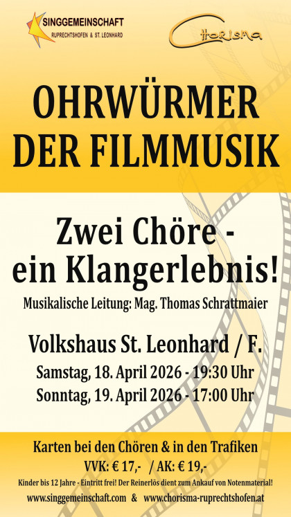 Gleich zwei Chöre bringen am 18. und 19. April 2026 das Volkshaus St. Leonhard am Forst zum Klingen: Unter dem Titel „Ohrwürmer der Filmmusik“ präsentieren die Singgemeinschaft Ruprechtshofen & St. Leonhard und Chorisma bekannte Melodien aus Film und Fernsehen.